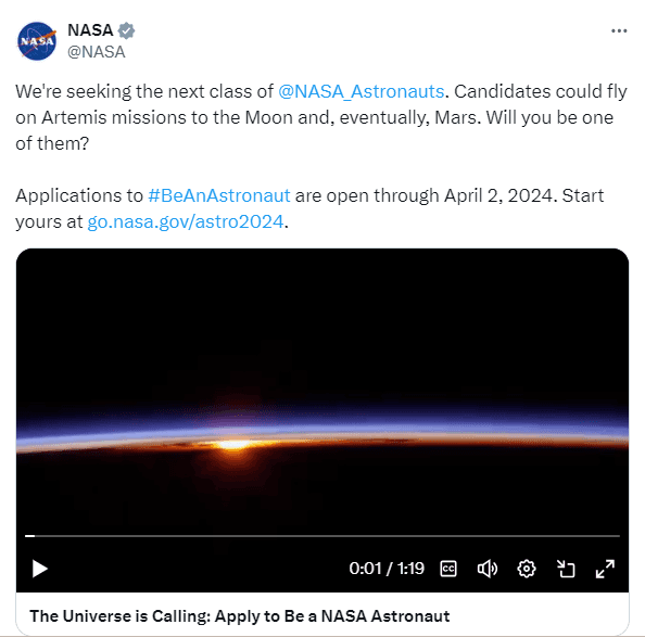 NASA Job: अमेरिकी अंतरिक्ष एडमिनिस्ट्रेशन नासा, अंतरिक्ष यात्री बनने का मौका लेकर आया है. नासा ने इसके लिए आवेदन मांगे हैं. अंतरिक्ष में सफर की ख्वाहिश रखनेवालों के लिए बड़ा अवसर है.