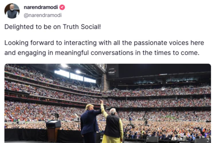 प्रधानमंत्री मोदी ने ट्रुथ सोशल पर अपने पहले पोस्ट में लिखा, “ट्रुथ सोशल पर आकर बहुत प्रसन्न हूं. यहां सभी उत्साही लोगों से चर्चा करने और आने वाले समय में सार्थक संवाद में शामिल होने के लिए उत्सुक हूं.” पीएम मोदी ने डोनाल्ड ट्रंप के साथ अपनी पुरानी तस्वीर भी शेयर किया. जिसमें ट्रंप और मोदी एक साथ हाथ ऊपर उठाकर लोगों को अभिवादन करते दिख रहे हैं.