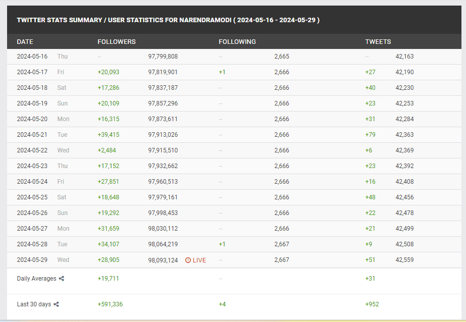 टॉप सोशल मीडिया प्लैटफॉर्म्स पर नजर रखनेवाली वेबसाइट ‘सोशल ब्लेड’ की मानें, तो एक्स पर फॉलोअर्स के मामले में टॉप-10 की लिस्ट में अकेले भारतीय प्रधानमंत्री नरेंद्र मोदी को हर दिन औसतन 19,711 नये फॉलोअर्स मिल रहे हैं. वहीं, पीएम मोदी जिन्हें फॉलो करते हैं, उनकी बात करें तो वह ट्विटर पर 2,667 लोगों को फॉलो करते हैं. इनमें कई राजनेता, पत्रकार और संस्थाएं शामिल हैं. एक्स पर प्रधानमंत्री मोदी का अकाउंट 10 जनवरी 2009 को बना और अब तक उन्होंने 42,559 पोस्ट किये हैं. अगर वर्तमान स्थिति में देखें, तो पीएम मोदी अपने पद पर रहते हुए सबसे ज्यादा ट्विटर फॉलोअर्स वाले दुनिया के पहले नेता हैं.