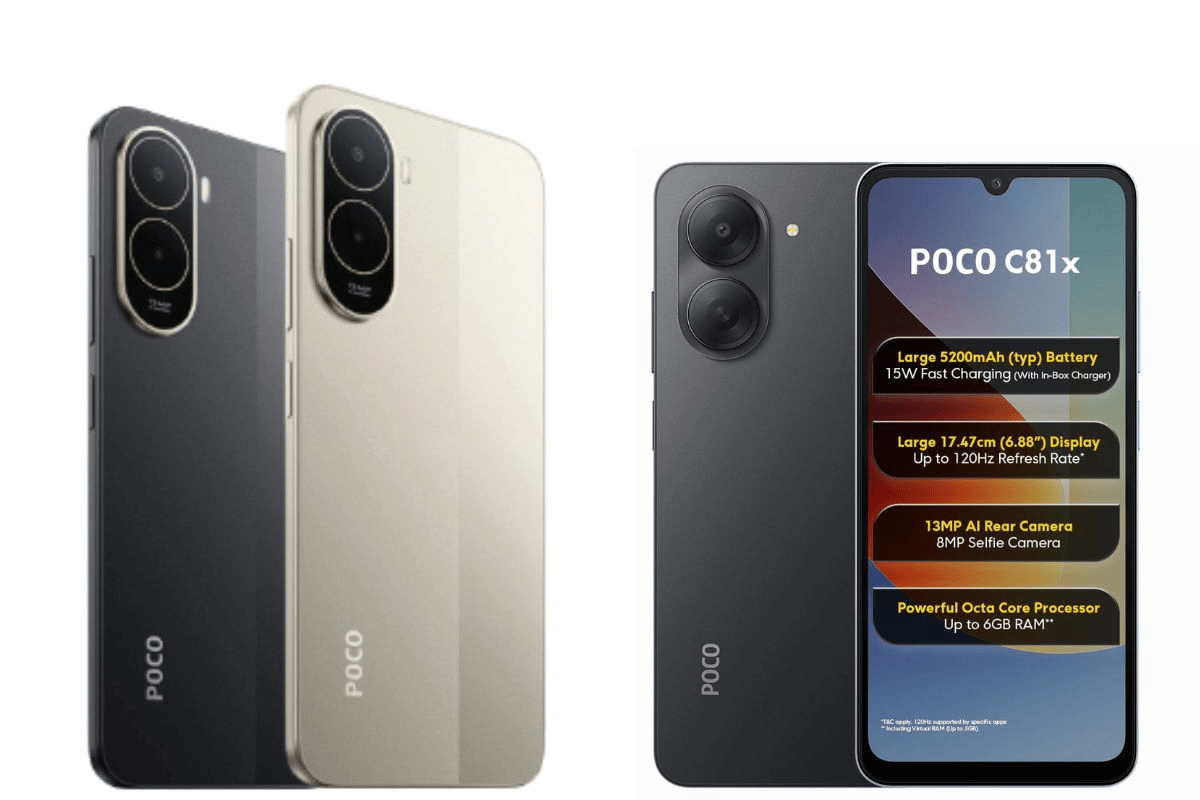 POCO C81x में भी एक ही वेरिएंट 3GB RAM + 64GB, जिसकी कीमत 9,999 रुपये है. यह Ice Blue और Crystal Black कलर ऑप्शन में मिलेगा.