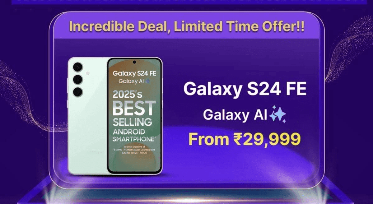 Samsung Galaxy S24 FE के 8GB+128GB वेरिएंट पर 50% तक का डिस्काउंट मिल रहा है. जिससे आप इस स्मार्टफोन को 59,999 रुपये की जगह 29,999 रुपये में खरीद सकेंगे. इसके अलावा Flipkart Axis क्रेडिट कार्ड पर 1500 रुपये का बैंक डिस्काउंट भी मिल रहा है. जिससे आप इसे 28,499 रुपये में खरीद सकेंगे. Samsung Galaxy S24 FE में 50MP+12MP डुअल रियर कैमरा, 10MP फ्रंट कैमरा, 4700mAh बैटरी, 6.7 इंच AMOLED डिस्प्ले और Exynos 2400e का प्रोसेसर दिया गया है.