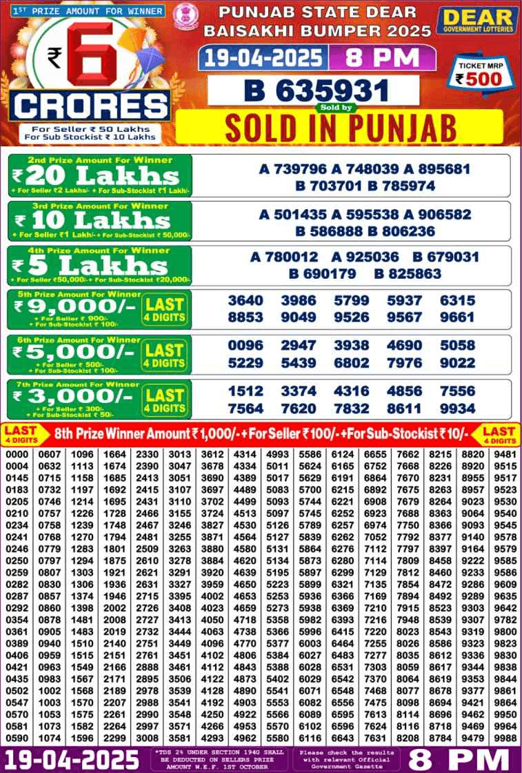 पंजाब स्टेट लॉटरी 19.04.2025: पंजाब बंपर लॉटरी स्कीम (Punjab Dear Baisakhi Bumper Lucky Draw)