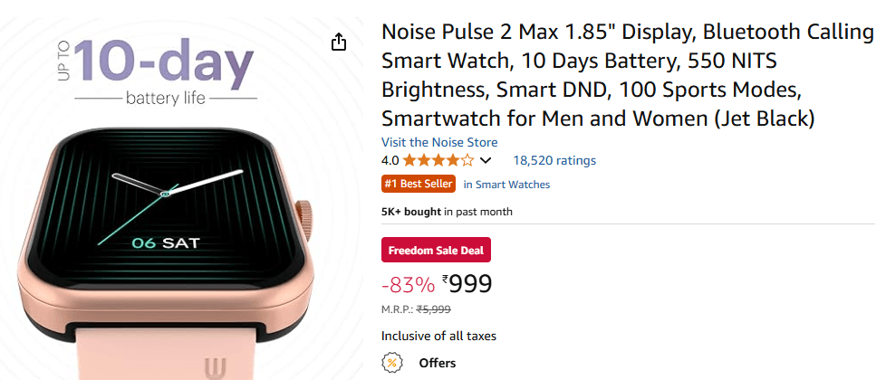 boAt के अलावा आप Noise के स्मार्टवॉच को भी ऑप्शन में रख सकते हैं. Noise का Pulse 2 Max आपकी बहन को काफी पसंद आएंगे. इस स्मार्टवॉच में 1.85 इंच का डिस्प्ले है, जो 550 निट्स तक की पीक ब्राइटनेस को सपोर्ट करता है. इसमें Bluetooth कॉलिंग से लेकर Smart DND और 100 स्पोर्ट्स मोड्स जैसे फीचर्स दिए गए हैं. 10 दिन के बैटरी बैकअप के साथ हेल्थ ट्रैकिंग फीचर्स भी मिलते हैं. इसकी कीमत अमेजन पर 999 रुपये है.