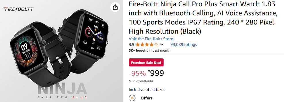 Fire-Boltt के स्मार्टवॉच भी दिखने में काफी स्टाइलिश होते हैं. ऐसे में आप Fire-Boltt के Ninja Call Pro Plus Smart Watch को भी ऑप्शन में रख सकते हैं. इस स्मार्टवॉच में 1.83 इंच की HD डिस्प्ले है. Bluetooth कॉलिंग से लेकर AI वॉइस असिस्टेंट जैसे फीचर्स दिए गए हैं। इसकी कीमत अमेजन पर सिर्फ 999 रुपये है.