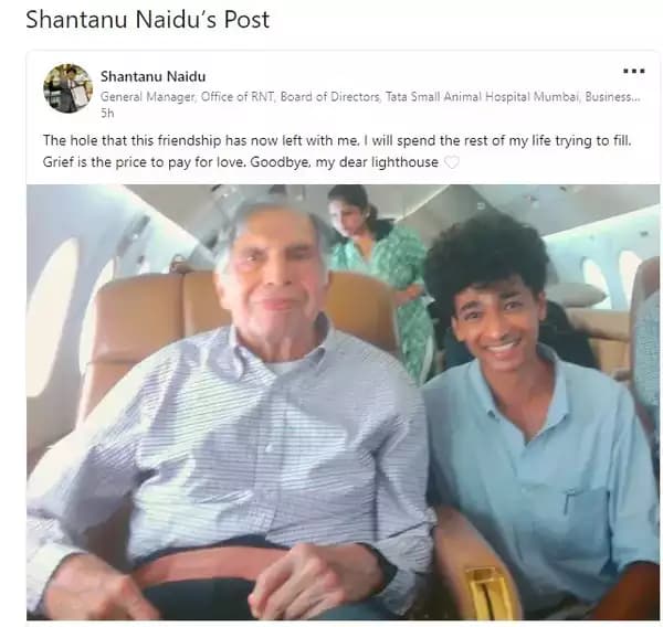 31 के नायडू को सुबह सभी ने येज्दी मोटरसाइकिल पर सवार होकर टाटा के घर से बाहर निकलते और उनके पार्थिव शरीर को ले जा रहे ट्रक के आगे चलते देखा. नायडू ने एक तस्वीर भी साझा की जिसमें दोनों एक चार्टर्ड विमान में बैठे नजर आ रहे हैं. उन्होंने लिखा, प्यार की कीमत चुकाने का जरिया दुख है. अलविदा, मेरी जीवन की रोशनी.