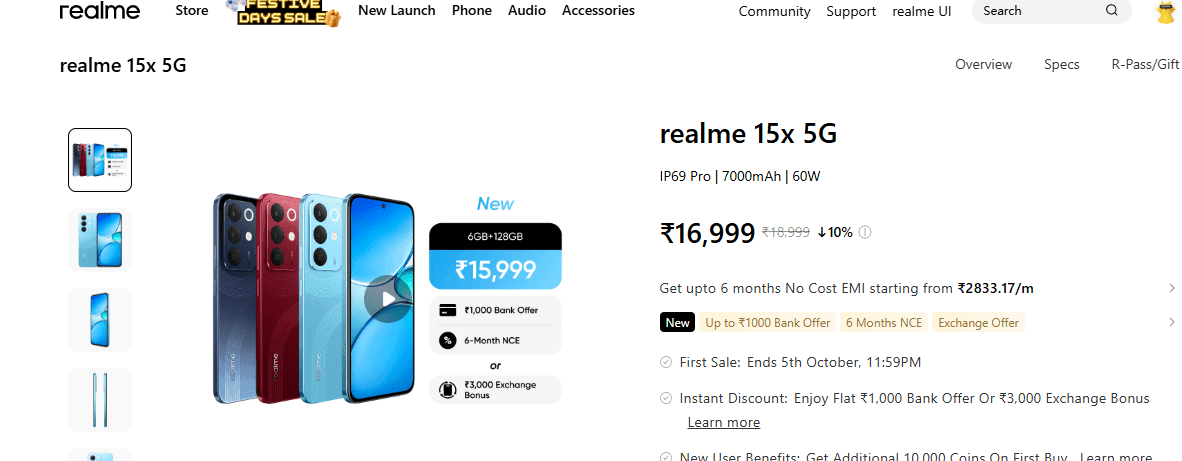 Realme ने अपने नए मॉडल Realme 15x 5G को कंपनी के ऑफिशियल वेबसाइट के अलावा ई-कॉमर्स शॉपिंग साइट Flipkart पर लॉन्च किया है. जहां इसकी सेल भी आज से शुरू हो गई है. इस मॉडल को कंपनी ने तीन वेरिएंट 6GB+128GB, 8GB+128GB और 8GB+256GB में लॉन्च किया है. मॉडल को तीन कलर Aqua Blue, Marine Blue और Maroon Red ऑप्शन में लॉन्च किया गया है. कीमत कि बात करें तो, बेस वेरिएंट की कीमत 16,999 रुपये, मिड वेरिएंट की कीमत 17,999 रुपये और टॉप वेरिएंट की कीमत 19,999 रुपये है. इसके अलावा तीनों वेरिएंट पर ICICI और Axis बैंक के क्रेडिट और डेबिट कार्ड पर 1000 रुपये का बैंक डिस्काउंट दिया जा रहा है. जिससे आप इस मॉडल को 1000 रुपये सस्ते में खरीद सकते हैं.
