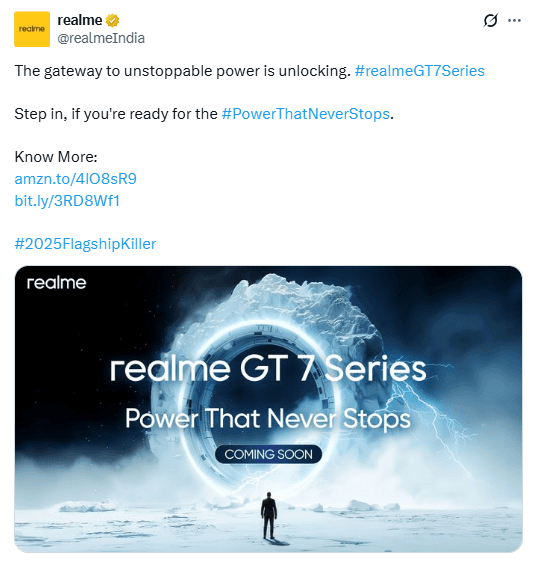 Realme India ने X (पूर्व में Twitter) पर पुष्टि की है कि यह नई बैटरी तकनीक आनेवाली Realme GT 7 सीरीज में दिखाई देगी. हालांकि लॉन्च डेट का खुलासा नहीं हुआ है, लेकिन GT 7 और GT 7T दोनों को BIS वेबसाइट पर देखा जा चुका है, साथ ही Geekbench लिस्टिंग भी सामने आई है.