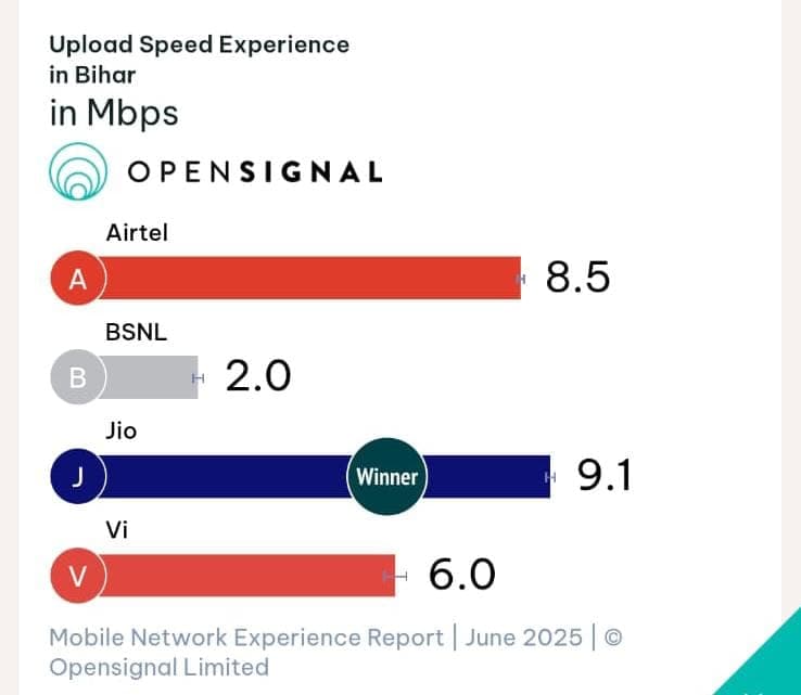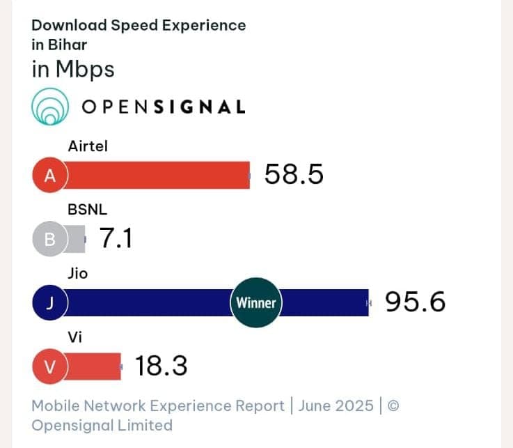 रिलायंस जियो ने बिहार टेलीकॉम सर्कल में औसत डाउनलोड स्पीड के मामले में एयरटेल, वोडाफोन-आइडिया और बीएसएनएल को एक बार फिर भारी अंतर से मात दी है. टेलीकॉम सर्विसेज की मानक ग्लोबल संस्था ओपन सिग्नल (OPEN SIGNAL) के हालिया जारी आंकड़ों के मुताबिक, रिलायंस जियो को 95.6 एमबीपीएस की स्पीड मिली हैं. प्रतिद्वंद्वी एयरटेल को 58.5 एमबीपीएस, वोडा-आइडिया को 18.3 एमबीपीएस और बीएसएनएल को 7.1 एमबीपीएस की स्पीड हासिल हुई है.