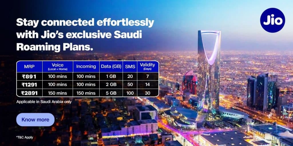 यूएई, कनाडा, थाईलैंड, और सऊदी अरब के लिए जियो के पैक्स में असीमित इनकमिंग एसएमएस, स्थानीय और अंतर्राष्ट्रीय कॉल, और हाई-स्पीड डेटा की सुविधा दी जा रही है. डेटा पैक खत्म होने के बाद भी उपयोगकर्ता 64 केबीपीएस की गति पर इंटरनेट का इस्तेमाल कर सकेंगे. साथ ही, वाई-फाई कॉलिंग के जरिये किसी भी देश से इनकमिंग कॉल्स का लाभ उठाया जा सकता है.