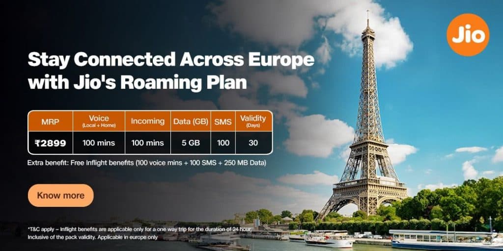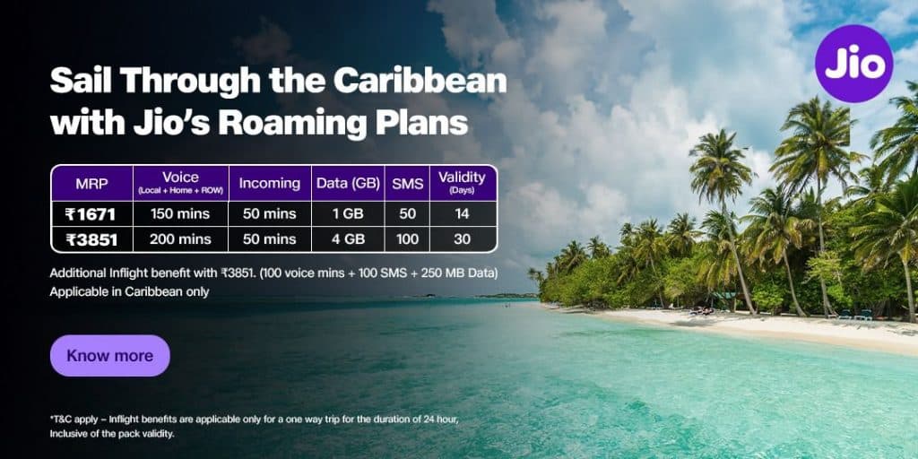 कैरिबियन के 24 देशों के लिए जियो ने विशेष प्लान्स पेश किये हैं, जिनमें 3851 रुपये के प्लान के साथ इनफ्लाइट बेनिफिट्स भी शामिल हैं. वहीं, यूरोप के 32 देशों के लिए प्लान भी इसी तरह के फायदों के साथ आते हैं. जियो ने 32 अंतरराष्ट्रीय गंतव्यों के दरों में 50 प्रतिशत तक की कटौती की है, जिससे विदेश यात्रा के दौरान कनेक्टेड रहना और भी किफायती हो गया है.