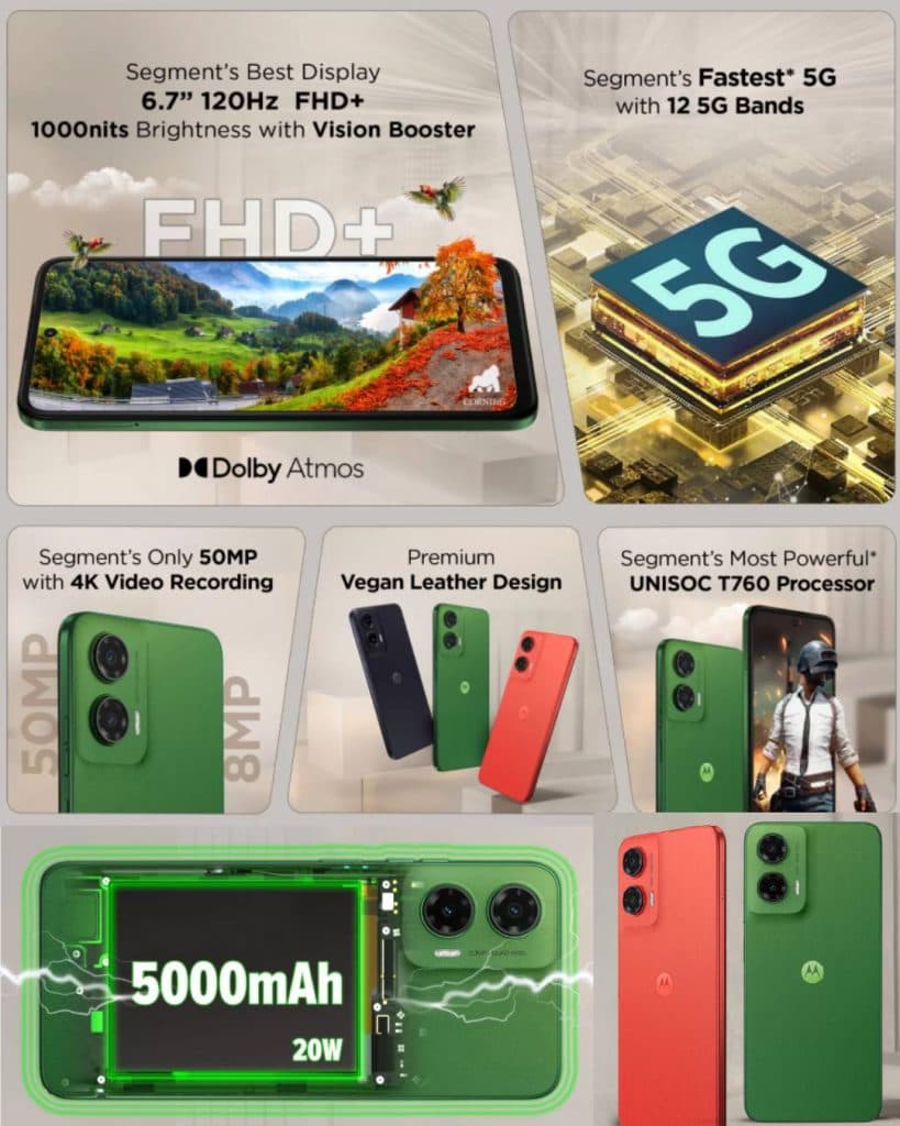 Moto G35 5G में 6.7 इंच का FHD+ डिस्प्ले है, जो 120Hz रिफ्रेश रेट और विजन बूस्टर टेक्नोलॉजी के साथ आता है. इसमें गोरिल्ला ग्लास 3 प्रोटेक्शन और IP52 रेटिंग भी है, जिससे यह पानी के छींटे सहन कर सकता है. यह Unisoc T760 प्रॉसेसर पर चलता है और 5,000mAh बैटरी के साथ 20W चार्जिंग सपोर्ट करता है.