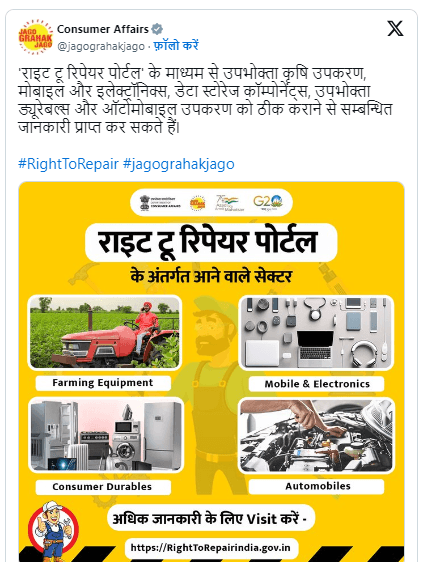उपभोक्ता मामले, खाद्य और सार्वजनिक वितरण मंत्रालय ने राइट टू रिपेयर पोर्टल बनाया है. इस पोर्टल का मकसद ग्राहकों को किसी भी प्रोडक्ट के रिपेयर से जुड़ी जानकारी देना है. यानी इस पोर्टल से आप खराब मोबाइल फोन, टीवी, वॉशिंग मशीन या बाइक के उसे पुराने से पुराने पार्ट के बारे में पता कर सकते हैं, जिसके बारे में कंपनी या सर्विस सेंटर वाले यह कहकर टाल दिया करते हैं कि फलां प्रोडक्ट का पार्ट नहीं मिल रहा है, फलां प्रोडक्ट बनना बंद हो गया, उसकी मरम्मत अब नहीं हो सकती और स्पेयर पार्ट नहीं मिलेगा. यही नहीं, कंपनियां किसी प्रोडक्ट को बनाने के लिए कस्टमर्स से एक्स्ट्रा पैसे भी वसूल नहीं पाएंगी. आसान भाषा में कहें, तो इस पोर्टल पर रिपेयर और सर्विस से जुड़े तमाम अधिकार मौजूद हैं.