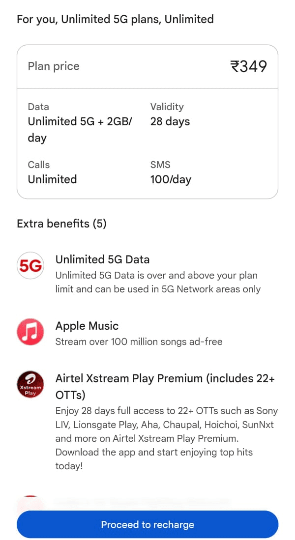 Airtel के 349 रुपये वाले प्लान में यूजर्स को सिर्फ 28 दिनों की वैलिडिटी मिलती है. जिसमें किसी भी नेटवर्क पर यूजर्स अनलिमिटेड कॉलिंग का फायदा उठा सकते हैं. साथ ही इस प्लान में यूजर्स को हर दिन 100 फ्री SMS के साथ-साथ डेली 2GB डेटा भी मिलता है. ऐसे में अगर आप 5G यूजर हैं, तो आपको हर दिन अनलिमिटेड डेटा का फायदा मिलेगा. इसके अलावा प्लान में मिलने वाले अन्य बेनेफिट्स कि बात करें तो इस प्लान में 6 महीनों के लिए Apple Music का फ्री सब्सक्रिप्शन, 28 दिनों के लिए JioHotstar और Airtel Xstream का फ्री सब्सक्रिप्शन मिलेगा.