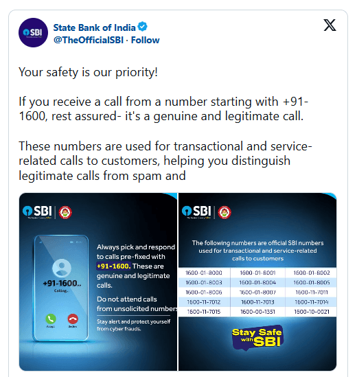SBI ने स्पष्ट किया है कि यदि आपको +91-1600 से शुरू होने वाले नंबरों से कॉल आती है, तो यह सुरक्षित और वैध है. ये नंबर केवल लेन-देन और सेवा संबंधी कॉल्स के लिए उपयोग किये जाते हैं.