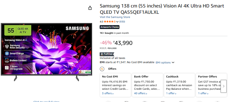 अगर आप अपने एंटरटेनमेंट सेटअप को ज्यादा स्मार्ट और ज्यादा इमर्सिव बनाना चाहते हैं, तो Samsung Vision AI QLED TV एक दमदार ऑप्शन है. इस टीवी का Q4 AI Processor हर कंटेंट को 4K क्वालिटी में अपस्केल करता है, जिससे तस्वीरें ज्यादा शार्प और डिटेल्ड नजर आती है. वहीं, Quantum HDR ब्राइटनेस और कॉन्ट्रास्ट को बैलेंस कर सिनेमैटिक फील देता है. परफॉर्मेंस के साथ-साथ यह टीवी स्मार्ट एफिशिएंसी पर भी फोकस करता है. इसमें 55 इंच का 4K Ultra HD QLED डिस्पले, Q-Symphony सपोर्ट के साथ 20W का साउंड आउटपुट दिया गया है. फीचर्स कि बात करें, तो Samsung TV Plus, स्मार्ट कंट्रोल के लिए SmartThings Hub, Multi View, Filmmaker Mode से ऑरिजिनल विजन वाला सिनेमा एक्सपीरियंस और AI Game Mode से स्मूद व रिस्पॉन्सिव गेमिंग जैसे स्मार्ट फीचर्स मिलेंगे. ई-कॉमर्स शॉपिंग साइट अमेजन पर यह टीवी पर 43,990 रुपये में लिस्टेड है.