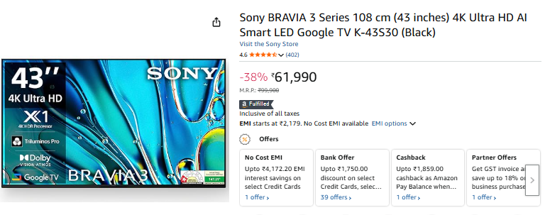 Sony BRAVIA 3 Series के 43 इंच स्मार्ट टीवी को छोटे साइज में बड़ा एक्सपीरियंस देने के लिए डिजाइन किया गया है. इसमें दिया गया 4K HDR Processor X1 हर फ्रेम को बेहतर बनाता है. साथ ही Triluminos PRO और 4K X-Reality PRO टेक्नोलॉजी मिलकर तस्वीरों को ज्यादा क्लियर और कलर्स को ज्यादा नेचुरल दिखाती है. फास्ट मूविंग सीन और स्पोर्ट्स के लिए MotionFlow XR 200 स्मूद और ब्लर-फ्री व्यू देता है, जबकि Dolby Vision और Dolby Atmos मिलकर छोटे रूम में भी थिएटर वाली फिलिंग देंगे. इसमें 60Hz रिफ्रेश रेट सपोर्ट के साथ 43-inch का 4K Ultra HD LED डिस्पले मिलेगा. साउंड के लिए डॉल्बी एटमॉस सपोर्ट के साथ 20W साउंड आउटपुट मिलेगा. यह Google TV OS पर चलेगा, जिससे कंटेंट एक्सेस, Chromecast और Apple AirPlay से मोबाइल स्क्रीन शेयरिंग और ALLM व Game Menu से कैज़ुअल गेमिंग का मजा आप बिना लैग के ले सकते हैं. कीमत कि बात करें, तो अमेजन पर 61,990 रुपये में यह टीवी लिस्टेड है.