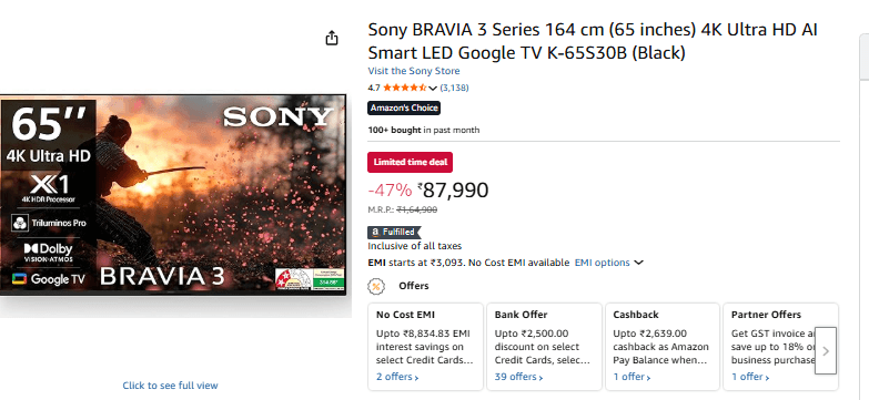 अगर आप एक ऐसा स्मार्ट टीवी ढूंढ रहे हैं, जो बड़ी स्क्रीन में प्रीमियम पिक्चर क्वालिटी दे और बिजली की खपत भी समझदारी से करे, तो Sony BRAVIA 3 एक बेहतरीन अपग्रेड साबित हो सकता है. इस टीवी में Dolby Vision और 60Hz रिफ्रेश रेट सपोर्ट के साथ 4K Ultra HD रेजोल्यूशन वाला 65 इंच डिस्पले दिया गया है. खास बात यह है कि टीवी कंटेंट के हिसाब से पावर कंजम्पशन को भी ऑटोमैटिकली ऑप्टिमाइज करता है. इसमें Dolby Atmos सपोर्ट के साथ 20W का साउंड आउटपुट दिया गया है. स्मार्ट फीचर्स कि बात करें तो Google TV, Chromecast और Apple AirPlay इसे हर प्लेटफॉर्म के लिए तैयार बनाते हैं. कीमत कि बात करें, तो ई-कॉमर्स शॉपिंग साइट अमेजन पर इस टीवी की कीमत 87,990 रुपये है.