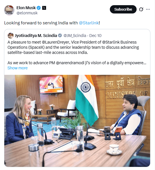 एलन मस्क ने केंद्रीय मंत्री ज्योतिरादित्य सिंधिया की पोस्ट पर प्रतिक्रिया देते हुए लिखा कि वे भारत में स्टारलिंक सेवा देने के लिए उत्साहित हैं. यह एक लाइन भले ही छोटी हो, लेकिन यह ऐसे समय आई है जब कंपनी और सरकार के बीच अंतिम दौर की बातचीत चल रही है. इससे साफ है कि भारत स्टारलिंक की प्राथमिकता सूची में सबसे ऊपर है.