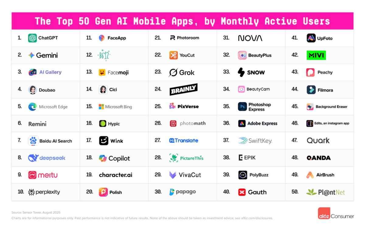 a16z की रिपोर्ट में 14 प्रमुख AI प्रोडक्ट्स को टॉप लिस्ट में जगह मिली है: