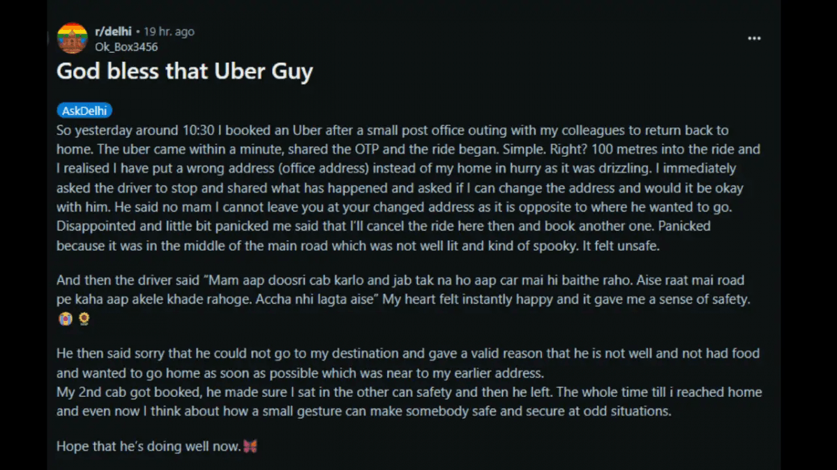 दिल्ली की एक महिला ने Reddit पर साझा किया एक भावुक अनुभव, जिसमें Uber ड्राइवर ने रात के अंधेरे में उसे सुरक्षित महसूस कराया. पढ़िए यह प्रेरणादायक VIRAL कहानी, जिसने इंटरनेट का दिल जीत लिया.