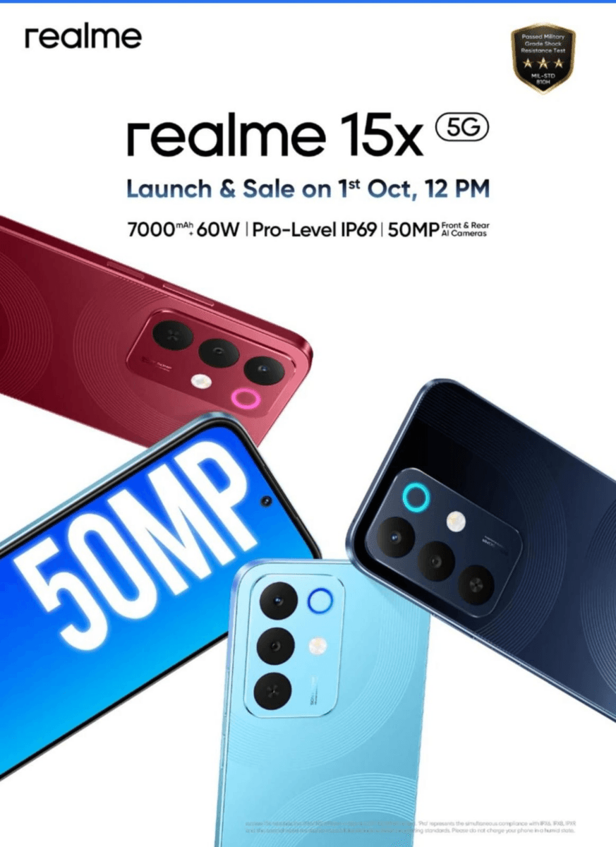 अक्टूबर की शुरुआत चाइनीज टेक कंपनी Realme के नए मॉडल से होने वाली है. कंपनी 1 अक्टूबर को अपना नया मॉडल Realme 15x 5G भारत में लॉन्च करने वाली है. कंपनी के ऑफिशियल वेबसाइट के अलावा Realme 15x 5G ई-कॉमर्स शॉपिंग साइट Flipkaart पर लॉन्च होने वाला है. इस मॉडल में 60W फास्ट चार्जिंग सपोर्ट के साथ 7000mAh बैटरी, फ्रंट और बैक में 50MP का कैमरा होगा. साथ ही यह फोन मिलिट्री ग्रेड से सर्टिफाइड है.