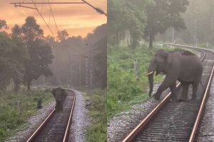 Viral Video: रेलवे ट्रैक पर टहल रहा था हाथी, तभी सामने से आ गयी ट्रेन, लोको पायलट ने फिर…