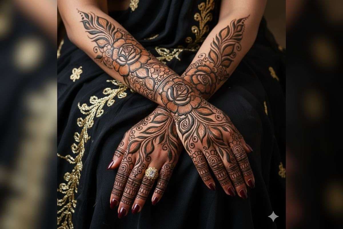 यह डिजाइन अरबी मेहंदी के स्टाइल में बनी है, जो बहुत गहरी और बोल्ड दिख रही है. इसमें बड़े-बड़े गुलाब के फूल और उनके चारों तरफ स्टाइलिश पत्तियां बनी हैं, जो हाथों से लेकर बाजू तक फैली हुई हैं. लाइन्स मोटी और डार्क हैं, जिससे डिजाइन का ड्रामैटिक लुक उभर कर आ रहा है. यह मॉडर्न और भरी हुई डिजाइन किसी भी मौके के लिए शानदार है खास कर वेडिंग के लिए.