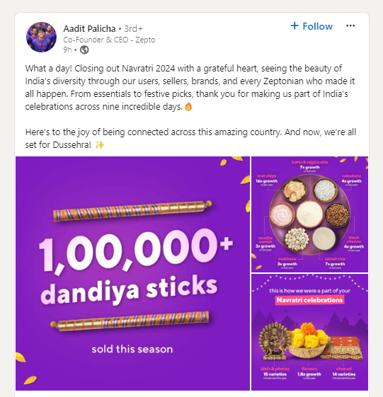 जेप्टो के को-फाउंडर और सीईओ आदित पलिचा ने लिंक्डइन पर लिखा, क्या दिन है! 2024 की नवरात्रि अपने उपयोगकर्ताओं, विक्रेताओं, ब्रांड और जेप्टो इस्तेमाल करने वालों के जरिये भारत की विविधता की खूबसूरती को देखते हुए संपन्न हो रही है. जरूरी वस्तुओं से लेकर त्योहारी चीजों तक, हमें नौ अविश्वसनीय दिनों में भारत के उत्सव का हिस्सा बनाने के लिए धन्यवाद.