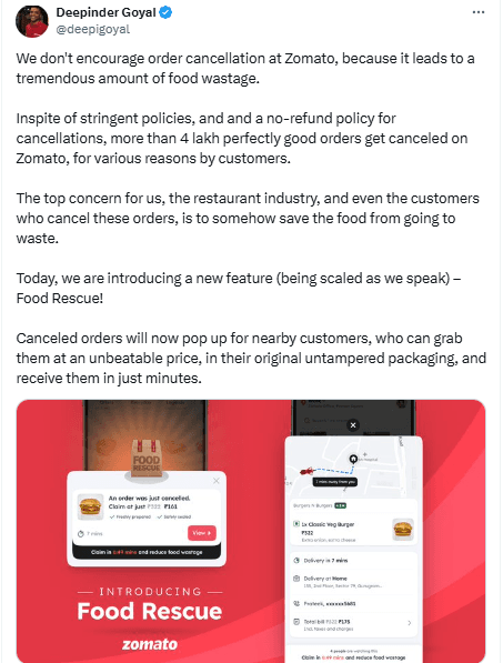 फूड रेस्क्यू फीचर जोमैटो इस पहल का मुख्य उद्देश्य खाने की बर्बादी को रोकना है, क्योंकि हर साल लाखों टन खाना फेंका जाता है, जबकि कई लोग भुखमरी से जूझते हैं. इसके अलावा, यह जोमैटो को अपने डिलीवरी नेटवर्क का अधिकतम उपयोग करने में मदद करेगा और साथ ही कस्टमर्स को एक बेहतर डील पाने का मौका मिलेगा.