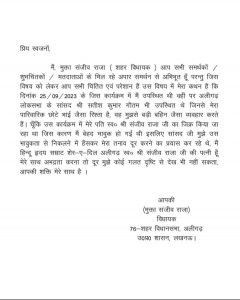 अलीगढ़ से भाजपा के सांसद सतीश गौतम ने पार्टी के एक कार्यक्रम में मंच पर अपनी ही पार्टी की विधायक को टच कर लिया था. इस मामले में नया मोड़ आया है. घटना को लेकर भाजपा विधायक मुक्ता राजा के नाम से पत्र सोशल मीडिया पर वायरल हो रहा है, हांलाकि विधायक ने लैटर जारी करने से इंकार किया है.