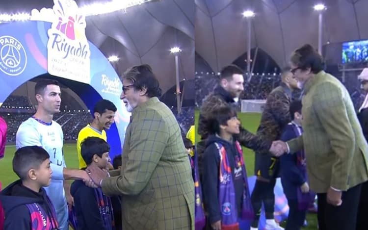 पेरिस सेंट जर्मेन और रियाद इलेवन के बीच मैच हुआ और इसमें अमिताभ बच्चन बतौर चीफ गेस्ट बनकर पहुंचे. इस दौरान एक्टर ने क्रिस्टियानो रोनाल्डो और लियोनल मेसी से हाथ मिलाया. इसकी तसवीरें उन्होंने अपने इंस्टाग्राम पर पोस्ट किया है. तसवीरों के साथ उन्होंने कैप्शन में लिखा, रियाद में एक शाम..’ क्या शाम है.. क्रिस्टियानो रोनाल्डो, लियोनेल मेसी, एम्बाप्पे, नेमार सभी एक साथ खेल रहे हैं.. और आपका वास्तव में खेल का उद्घाटन करने के लिए आमंत्रित अतिथि है.. पीएसजी बनाम रियाद सीजन.. अविश्वसनीय.