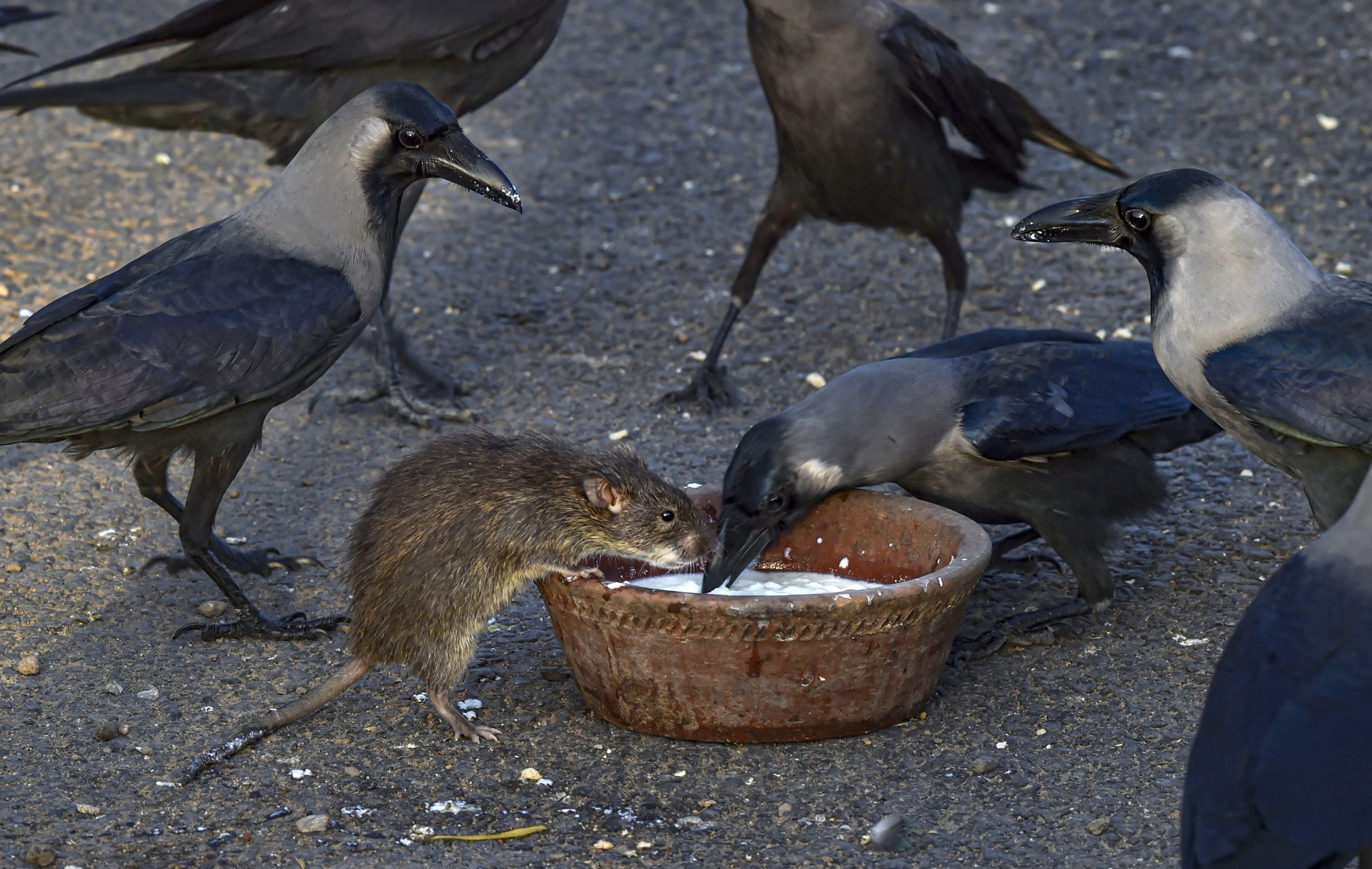 New Delhi: Rats and a crows share food left by people on a roadside during the nationwide lockdown to curb the spread of coronavirus, in New Delhi, Wednesday, April 22, 2020. (PTI Photo/Manvender Vashist) (PTI22-04-2020_000223B)