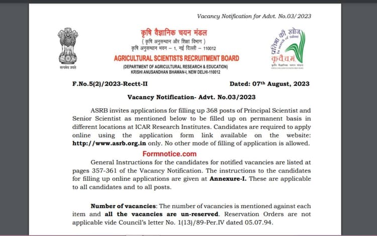 ASRB Recruitment 2023: कृषि वैज्ञानिक भर्ती बोर्ड (एएसआरबी) ने 7 अगस्त 2023 को आधिकारिक वेबसाइट www.asrb.org.in पर एएसआरबी भर्ती 2023 की आधिकारिक अधिसूचना 368 रिक्तियों के लिए जारी की है. विज्ञापित रिक्तियां भारतीय कृषि अनुसंधान परिषद (आईसीएआर) में विभिन्न स्थानों पर प्रधान वैज्ञानिक, वरिष्ठ वैज्ञानिक पदों जैसे विभिन्न पदों के लिए हैं. एएसआरबी भर्ती 2023 के लिए ऑनलाइन आवेदन 18 अगस्त 2023 से शुरू होंगे. इच्छुक उम्मीदवार विज्ञापित पदों के लिए आवेदन करने से पहले नीचे दिए गए लेख में एएसआरबी भर्ती 2023 का विवरण देख सकते हैं.ASRB Recruitment 2023: ओवरव्यू