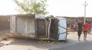 ट्रक पलटने से ऊपर बैठे दो मजदूर गिरने से घायल
