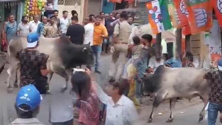 हावड़ा के साल्किया इलाके में टीएमसी सुप्रीमो ममता बनर्जी की चुनावी सभा थी. सीएम ने रोड शो भी किया. जब रोड शो समापन की ओर था तभी एक सांड घुस गया. जो भी उसके सामने आया, उसे सांड मारने के लिए दौड़ने लगा. उस समय ममता बनर्जी व्हीलचेयर पर बैठकर शिवपुर से तृणमूल कांग्रेस के उम्मीदवार के समर्थन में रैली कर रही थीं. काजीपाड़ा से सम्मीलन पार्क तक मुख्यमंत्री की रैली हुई.