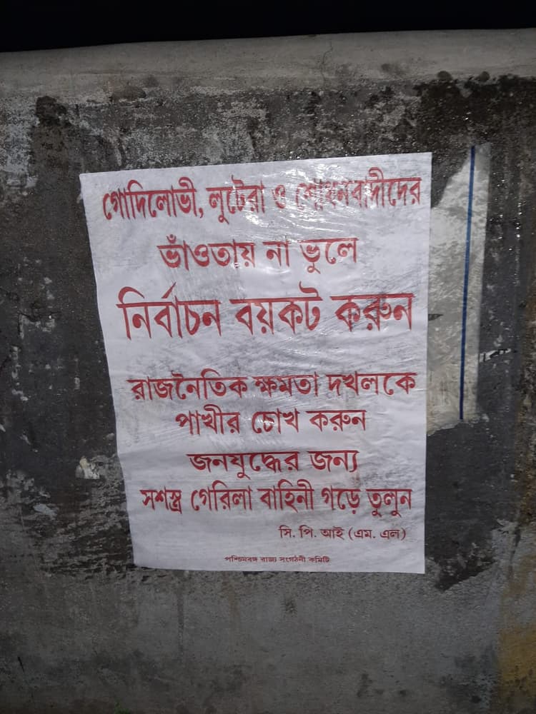 पोस्टर सीपीआई (एमएल) की ओर से लगाया गया है. पोस्टर में चुनाव बहिष्कार करने का आह्वान किया गया है , पोस्टर लाल स्याही से लिखा गया हैं. दुर्गापुर के प्रशासनिक भवन के समीप इस तरह के पोस्टर पाए जाने को लेकर लोगों के मन में कई तरह के प्रश्न खड़े हो गए हैं.