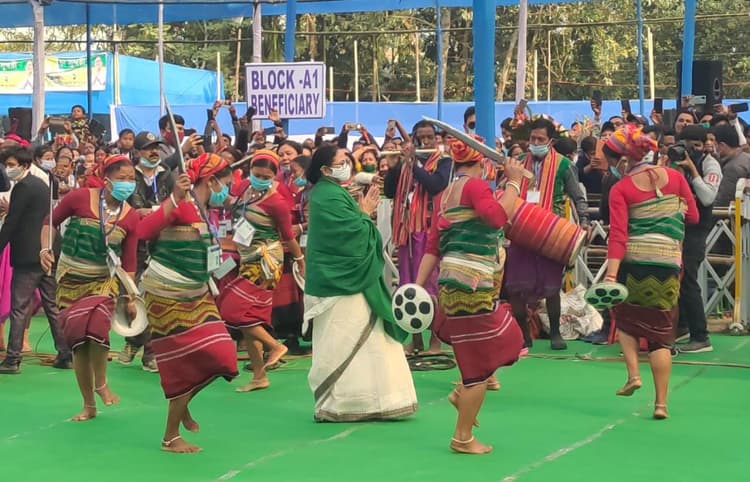Bengal Chunav 2021, Siliguri News, फालाकाटा न्यूज (अजय साह) : चार दिवसीय उत्तर बंगाल दौरे के दूसरे दिन अलीपुरदुआर जिले के फालाकाटा में आयोजित आदिवासियों के सामूहिक विवाह समारोह में शामिल होने पश्चिम बंगाल की मुख्यमंत्री ममता बनर्जी पहुंचीं. दोपहर लगभग 1:00 बजे उनका काफिला आयोजित समारोह के मैदान में पहुंचा. इसके बाद मुख्यमंत्री मंच पर पहुंचीं. उन्होंने विवाह के लिए मंडप पर बैठे आदिवासी समुदाय के नवदंपतियों का अभिनंदन किया. बाद में मंच से उतर कर मंडप में बैठे हुए दंपतियों के समक्ष उन्हें उपहार दीं. इसके बाद न्होंने आदिवासी समुदाय के कलाकारों के साथ नृत्य भी किया. इस दौरान मुख्यमंत्री ने चाय श्रमिकों के लिए चाय सुंदरी परियोजना के तहत 4600 नए घर प्रदान किये हैं.