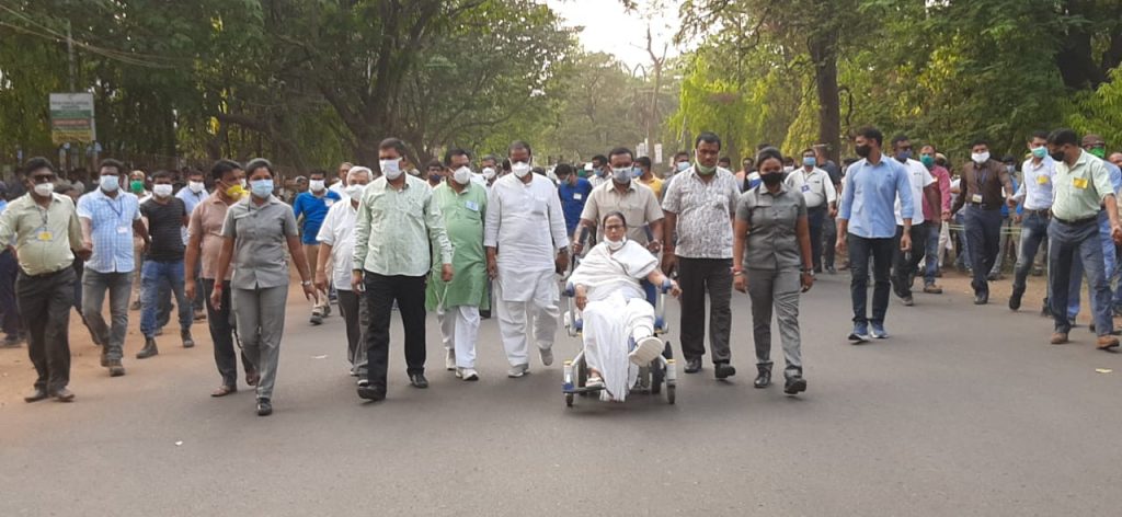 वहीं मौजूद महिलावो द्वारा बांगला नीजेर मे के चाय का जम कर नारा लगाये गए. पैर में चोट होने के कारण हेलीकॉप्टर के गेट के समक्ष उतरने के लिए चैनल सिस्टम के माध्यम से मुख्यमंत्री को उतारा गया, ताकि व्हीलचेयर आसानी से उतर कर नीचे आ जाए. कड़ी सुरक्षा के तहत ममता बनर्जी को हेलीकॉप्टर से उतारा गया . एवं व्हील चेयर पर बैठकर मैदान से बाहर निकली एवं हाथ जोड़ते हुए समर्थकों का उत्साह भरते हुए 300 मीटर की दूरी पर स्थित निधि होटल पहुंची.