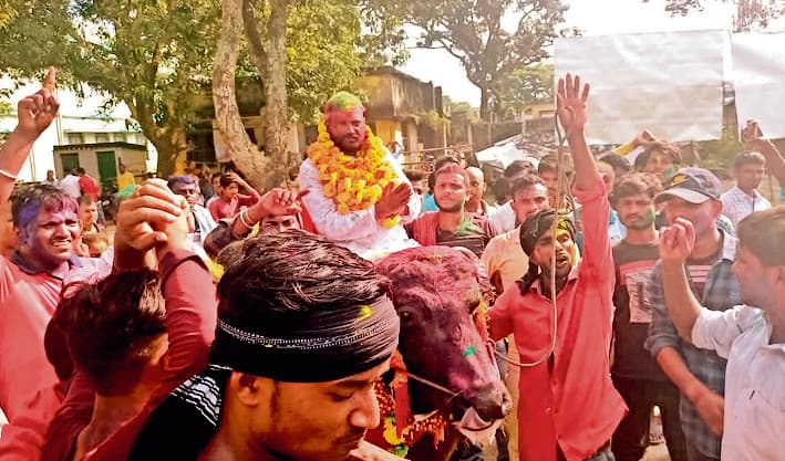 बिहार पंचायत चुनाव 2021 के लिए अलग-अलग चरणों में नामांकन की प्रक्रिया जारी है. इस बीच मधेपुरा में एक अनोखा दृश्य देखने को मिला. एक उम्मीदवार भैंसे पर चढ़कर नामांकन करने आए. एक तरफ जहां प्रत्याशी स्कॉर्पियो, थार और फॉर्च्यूनर जैसे महंगे वाहनों पर सवार होकर समर्थकों के साथ नामांकन करने आते हैं वहीं बुधवार को कुमारखंड प्रखंड मुख्यालय में मुखिया पद के लिए नॉमिनेशन करने एक उम्मीदवार भैंसे पर चढ़कर आए.