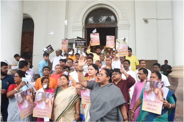पश्चिम बंगाल के विधानसभा में भाजपा ने राज्य में महिलाओं के खिलाफ अपराध के मुद्दे पर स्थगन प्रस्ताव पेश किया. भाजपा विधायकों ने विधानसभा में अग्निमित्रा पॉल के नेतृत्व में सरकार के खिलाफ विरोध प्रदर्शन भी किया और नारे लगाए. भाजपा विधायकों का कहना है कि बंगाल में महिलाओं पर लगातार हिंसा हो रही है लेकिन मुख्यमंत्री चुप क्यों बैठी है. भाजपा नेता व विधायक अग्निमित्रा पाल ने कहा कि अगर मणिपुर हिंसा पर बात हो सकती है तो मालदा में महिलाओं के साथ हुई हिंसा पर बात क्यों नहीं हो सकती है. हम मणिपुर हिंसा पर भी चर्चा करने के लिये तैयार है लेकिन बंगाल में महिला हिंसा पर बात करने के लिये कोई तैयार नहीं है. हमारा प्रदर्शन ऐसे ही जारी रहेगा.