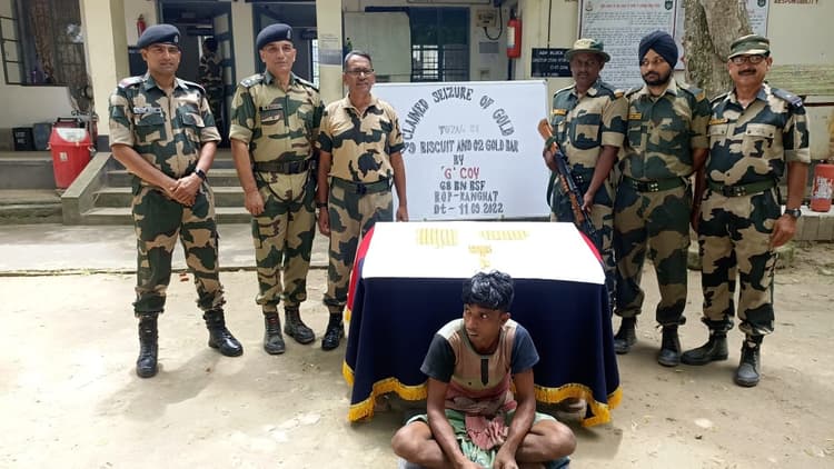 पश्चिम बंगाल के उत्तर 24 परगना जिले में सोमवार की सुबह दक्षिण बंगाल सीमान्त के अंतर्गत जिले के सीमावर्ती इलाके में तैनात 68 वीं वाहिनी की सीमा चौकी रनघाट के जवानों ने अपनी मुस्तैदी का परिचय देते हुए एक तस्कर को 81 सोने के बिस्किट (gold biscuits) के साथ दबोच लिया, जिन्हे वह अवैध तरीके से बांग्लादेश से भारत ला रहा था. जब्त किए गए बिस्किटों का कुल वजन 9.792 किलोग्राम है, जिनका बाजार मूल्य 5,02,83,511 रुपये हैं. गिरफ्तार तस्कर की पहचान उत्तर 24 परगना जिले के नाजिम मंडल (31) के रूप में हुई है.
