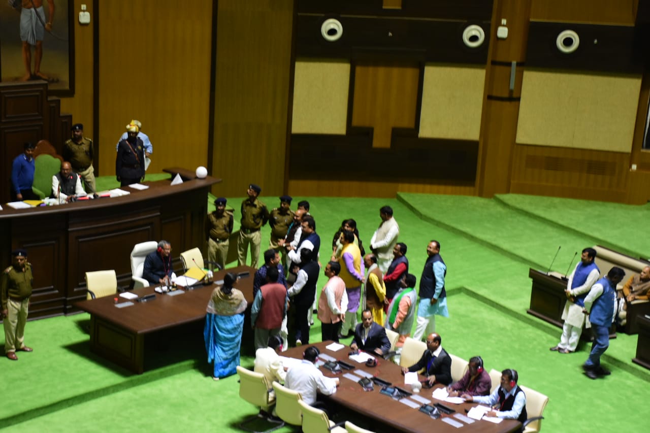 विपक्षी दल भाजपा के हंगामे के बीच विधानसभा अध्यक्ष रवींद्र नाथ महतो ने अपना भाषण दिया. शोक प्रस्ताव के बाद सदन की कार्यवाही सोमवार दिन के 11 बजे तक स्थगित कर दी गयी. इससे पूर्व, कार्यवाही शुरू होते ही भाजपा विधायकों ने वेल में पहुंचकर हंगामा शुरू कर दिया. विधायकों की मांग थी कि बाबूलाल मरांडी को नेता प्रतिपक्ष की कुर्सी पर बैठाया जाये. भाजपा के विधायक विरंची नारायण ने कहा कि अगर मरांडी को नेता प्रतिपक्ष का दर्जा नहीं मिला, तो सदन नहीं चलने देंगे.