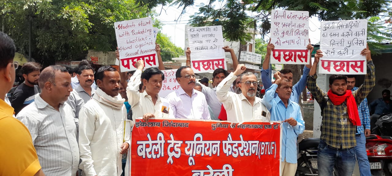 बरेली : उत्तर प्रदेश के बरेली में गुरुवार को ट्रेड यूनियंस फेडरेशन ने महिला पहलवानों के समर्थन में एक जुलूस निकाला. पहलवानों को न्याय देने,और आरोपी सांसद बृजभूषण शरण सिंह की गिरफ्तारी की मांग की.इसके साथ ही दिल्ली की नाबालिक छात्रा की हत्या पर रोष जताया.राष्ट्रपति को संबोधित ज्ञापन भेजा. केंद्रीय श्रम संगठनों के देशव्यापी आंदोलन के तहत गुरुवार को बरेली में ट्रेड यूनियंस फेडरेशन ने महिला पहलवानों को न्याय मिलने में हो रही देरी पर विरोध दर्ज जताया. उन्होंने आरोपी सांसद बृजभूषण शरण सिंह के खिलाफ नारेबाजी की.ट्रेड यूनियन के पदाधिकारियों ने कहा कि पहलवान देश की शान हैं.इन्होंने देश को मेडल दिलाएं हैं, लेकिन उनके साथ इस तरह का बर्ताव ठीक नहीं है.ट्रेंड यूनियंस फेडरेशन के धरने प्रदर्शन में छात्र संगठन भी शामिल हुए .