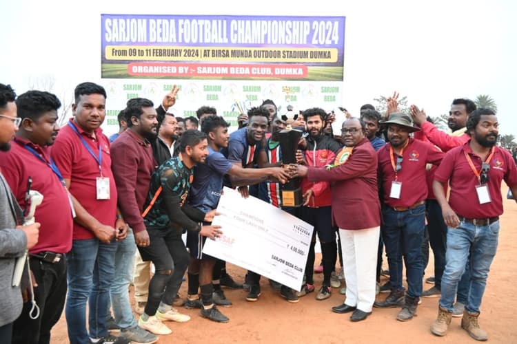 दुमका : सारजोम बेड़ा फुटबॉल चैंपियनशिप 2024 का महामुकाबला छत्तीसगढ़ के रायपुर फुटबाॅल क्लब ने जीत लिया है. रोमांचक मुकाबले में रायपुर फुटबाॅल क्लब ने बिरसा मंडा क्लब रांची को 2-1 से पराजित किया. विजेता टीम को कार्यक्रम के मुख्य अतिथि बोरियो विधायक लोबिन हेंब्रम ने विनर ट्राफी के अलावा चार लाख रुपये का इनाम प्रदान किया, वहीं उप विजेता रही बिरसा मुंडा क्लब रांची की टीम को विशिष्ट अतिथि पूर्वमंत्री डॉ लोइस मरांडी ने रनर ट्राफी व 3 लाख रुपये का इनाम प्रदान किया. वहीं तीसरे व चौथे स्थान पाने वाली टीम को 75-75 हजार रुपये का नकद इनाम सांसद प्रतिनिधि व समाजसेवी अमरेंद्र सिंह मुन्ना, विधायक प्रतिनिधि दिनेश मुर्मू व जिला खनन पदाधिकारी कृष्ण कुमार किस्कू ने प्रदान किया. वहीं मैन ऑफ दी सीरिज का पुरस्कार जिला शिक्षा अधिकारी आशीष कुमार हेंब्रम ने विजेता टीम रायपुर फुटबाल क्लब छत्तीसगढ़ के अमित टुडू को 25000 रुपये का पुरस्कार प्रदान किया, जबकि बेस्ट स्कोरर ऑफ दी टूर्नामेंट का पुरस्कार विदेशी मूल के व बिरसा मुंडा फुटबाल क्लब के खिलाड़ी ऑर्टिगा को 5000 रुपये व बेस्ट गोलकीपर ऑफ दी टूर्नामेंट का पुरस्कार रायपुर के ही राणा चक्रवर्ती को 5000 रुपये से सम्मानित किया गया. सामाजिक कार्यकर्ता सुरेश मुर्मू ने सभी तकनीकी पदाधिकारियों व रेफरी को सम्मानित किया.