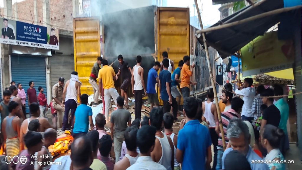 घटनास्थल पर मौजूद लोगों का कहना है कि कंटेनर में कार्टन भरा हुआ था. बाजार में प्रवेश करते ही 11 हजार वोल्ट के हाईटेंशन तार की चपेट में कंटेनर आ गया. देखते ही देखते कंटेनर में आग लग गयी. कंटेनर चालक उत्तर प्रदेश के प्रतापगढ़ का निवासी शत्रुधन कुमार बताया जा रहा है. उसने किसी तरह कंटेनर से कूद कर अपनी जान बचाई.