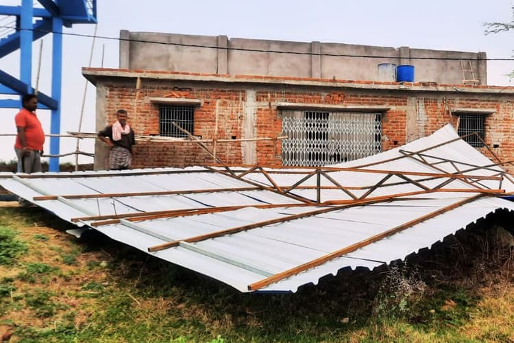 Cyclone in Chatra| इटखोरी (चतरा), विजय शर्मा : चतरा जिले के इटखोरी में आंधी चली और पैक्स गोदाम के निर्माण में इस्तेमाल हो रहा ‘ब्लू टिन शेड’ उड़कर गिर गया. इसकी वजह से एक मजबूर की मौत हो गयी. मृतक का नाम देवनारायण शर्मा उर्फ छोटन विश्वकर्मा है. इस हादसे में कालीचरण विश्वकर्मा घायल हुआ है. हजारीबाग के एक निजी क्लिनिक में उसका इलाज चल रहा है. घटना इटखोरी के परसौनी की है.