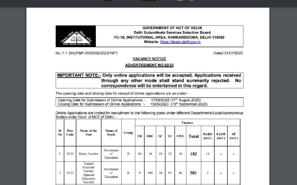 विवरण देखें : https://dsssb.delhi.gov.in/sites/default/files/DSSSB/marquee-files/advt_no_02-23.pdf