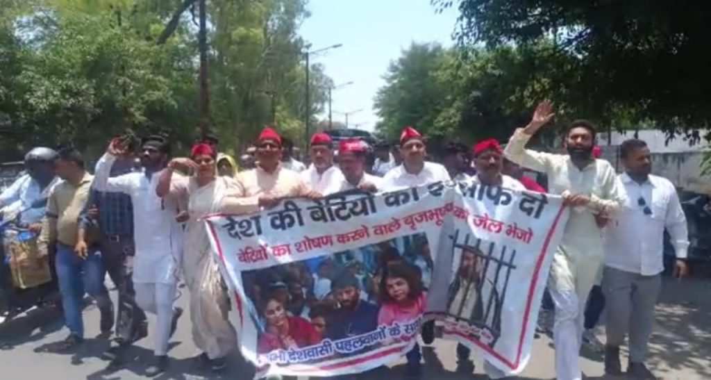 अलीगढ़ में बृजभूषण शरण सिंह की गिरफ्तारी के लिए प्रदर्शन, सपा ने किया लोकसभा सदस्यता रद्द करने की मांग