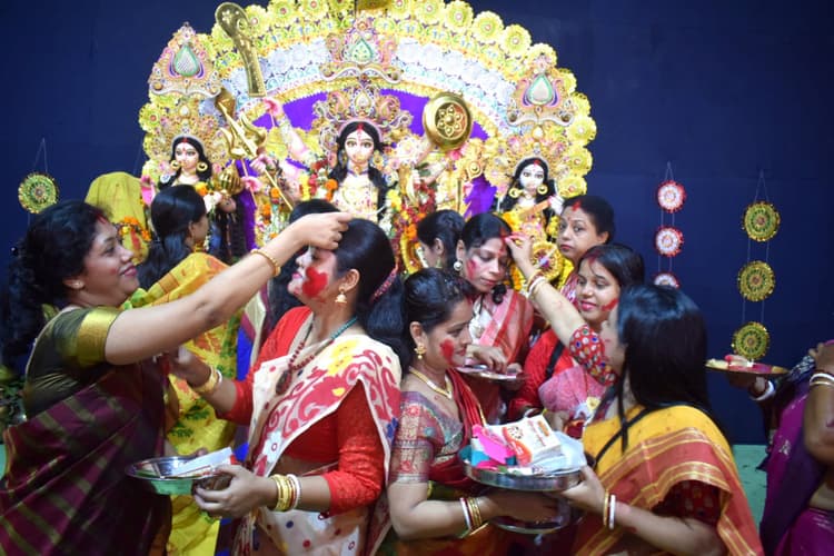 मूर्ति विसर्जन से पहले पंडालों में सिंदूर खेला के दौरान पूरा माहौल भक्तिमय हो गया. ऐसी मान्यता है कि ऐसा करने से पति की उम्र लंबी होती है. माता को मिठाई खिलाने के बाद नम आंखों से उनको विदाई दी गई.
