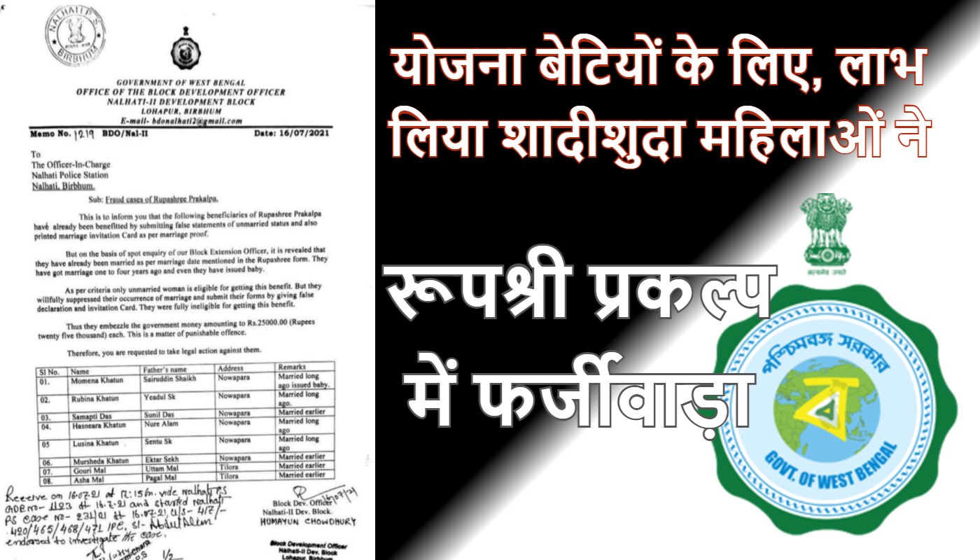 बीरभूम/पानागढ़ (मुकेश तिवारी): पश्चिम बंगाल में हर दिन किसी न किसी फर्जी अधिकारी की गिरफ्तारी के बीच गरीब परिवार की बेटियों के लिए ममता बनर्जी सरकार की ओर से शुरू की गयी रूपश्री योजना में लाखों रुपये के गबन का खुलासा हुआ है. इस सिलसिले में 8 लोगों के खिलाफ प्राथमिकी दर्ज की गयी है.